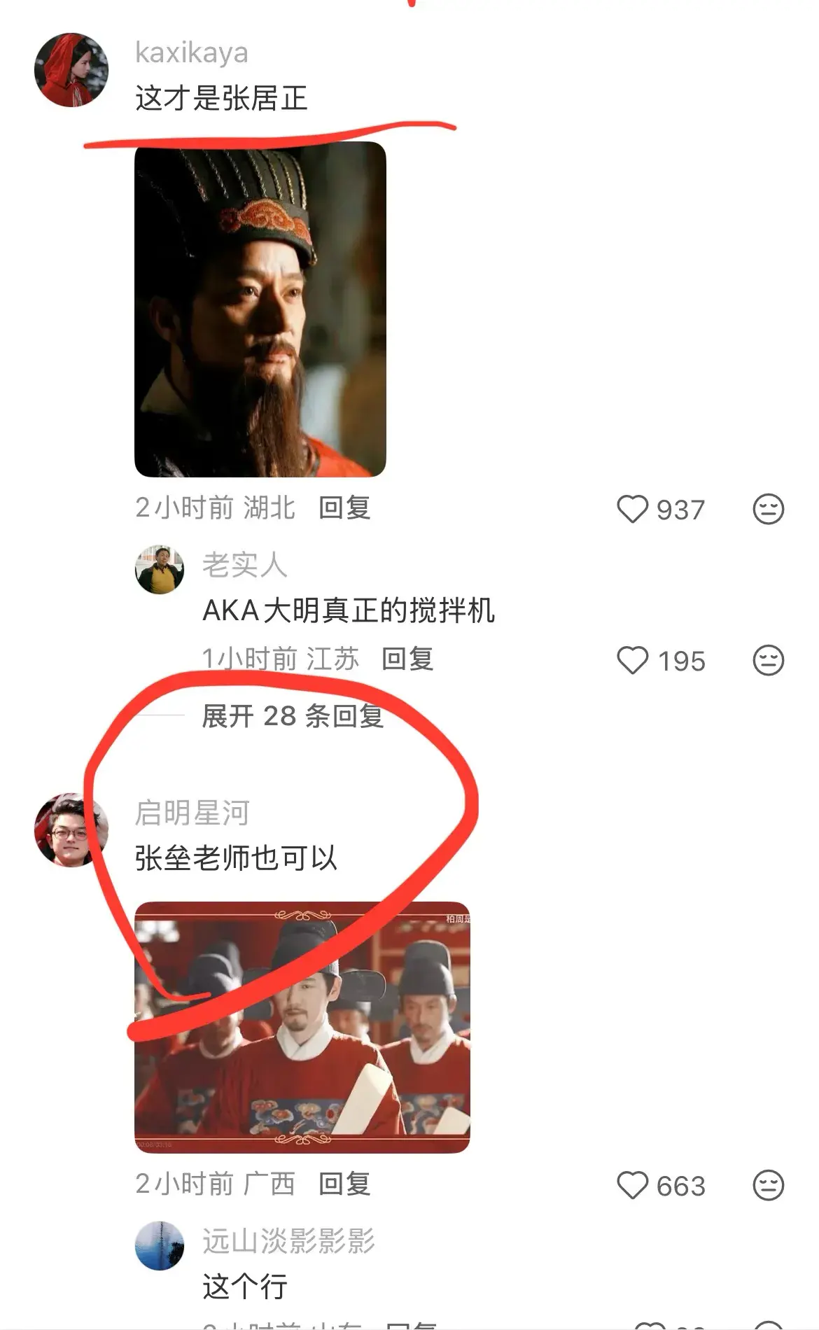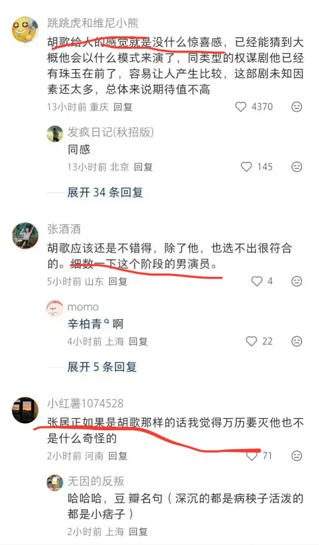“我觉得谁都比官宣的强,(张居正)就是得有沧桑执拗苦命隐忍等各种特质,这个跟梅长苏那种苦命不同。”