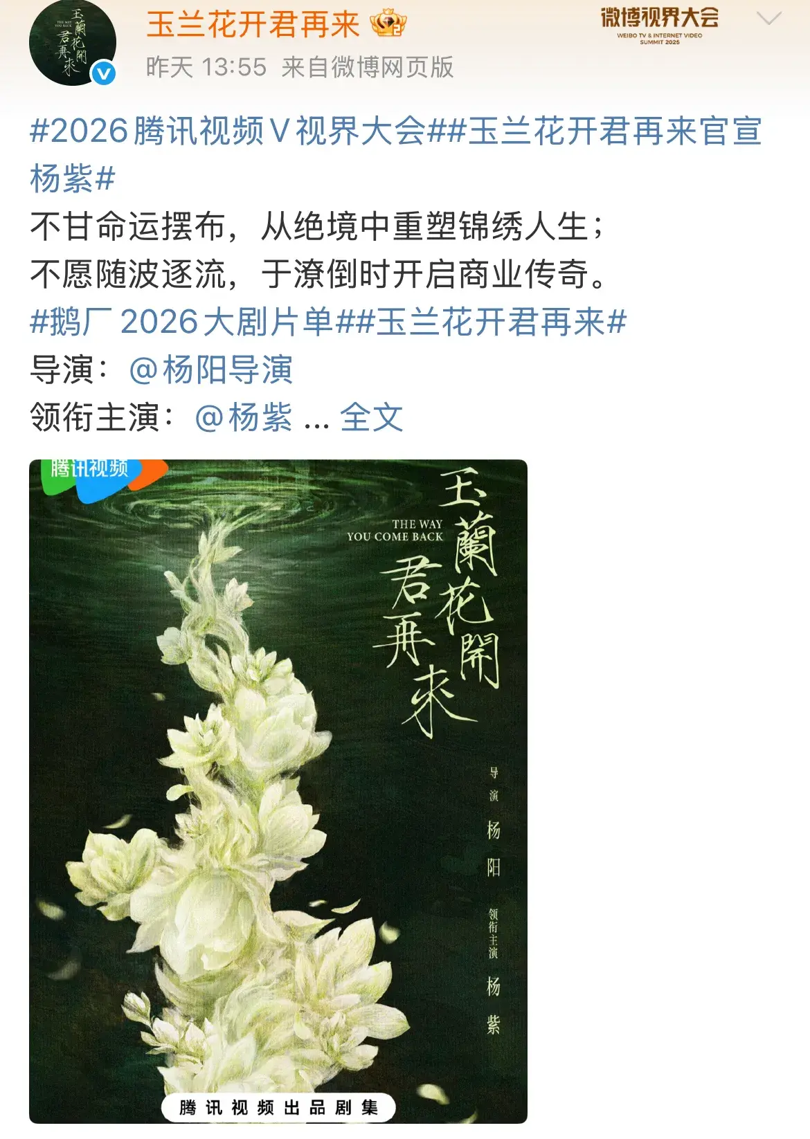 此次大会上,鹅厂正式官宣杨紫出演《玉兰花开君再来》,该剧根据真实历史人物,上海锦江饭店创始人董竹君女士,生平事迹改编。对于杨紫来说,这是一部很有挑战性,同时也是很有意义的剧。
