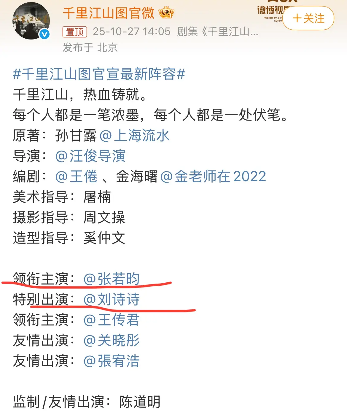 前面提到,谍战剧《千里江山图》官宣了张若昀。其实,该剧除了张若昀外,还官宣了女主刘诗诗。