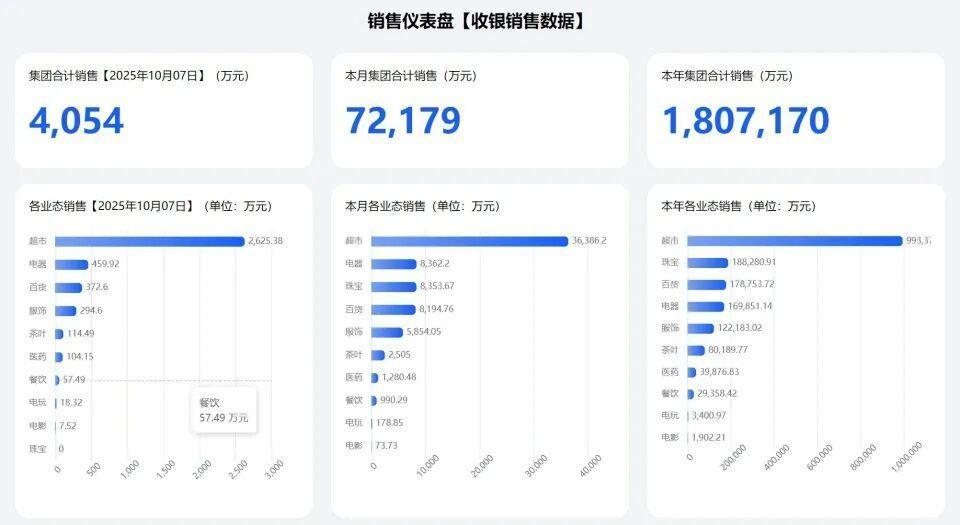 九派新闻注意到,从其各业态销售数据来看,超市仍是收入的主力,不管是当日(10月7日)、本月还是本年,超市的收入都远超电器、百货、餐饮等业态。